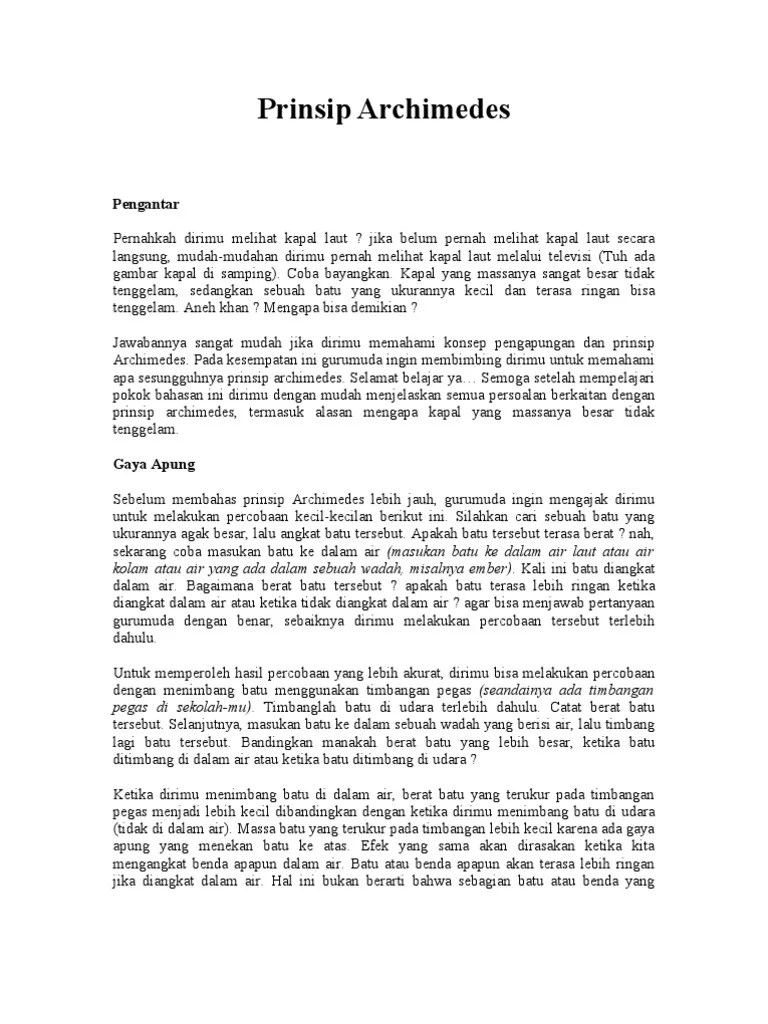 Melalui tanya jawab, siswa mampu memberikan contoh. Diantaranya adalah hukum pascal, archimedes, tekanan hidrostatis, kapilaritas,. Laporan fluida gaya archimedes praktikum yang berjudul hukum archimedes ini bertujuan untuk menyelidiki . Yang bertanda tangan dibawah ini: Lembar pernyataan keaslian karya ilmiah.